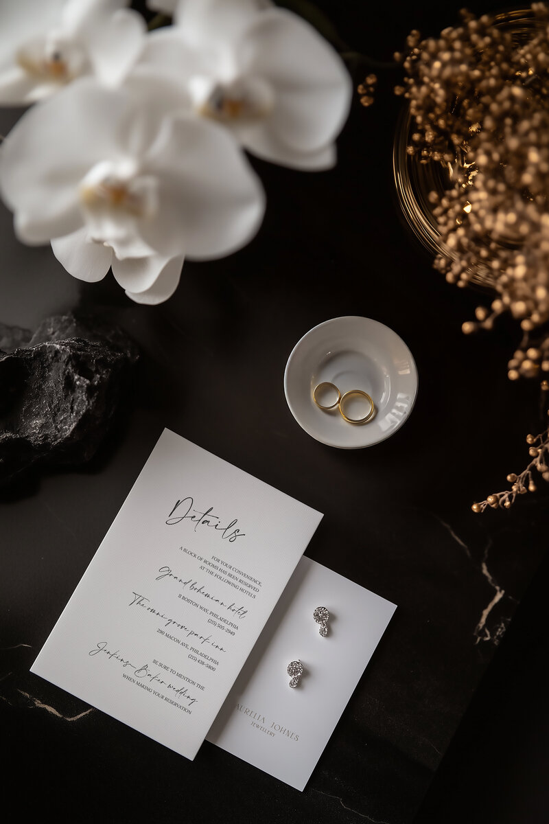 The small details tell the story of your wedding day—your dress, rings, bouquet, heirloom jewelry, and invitation suite all play a role. I recommend setting aside all your special details in one place so I can photograph them first thing in the morning. These images beautifully complement your full wedding gallery and capture the little touches you put so much thought into.